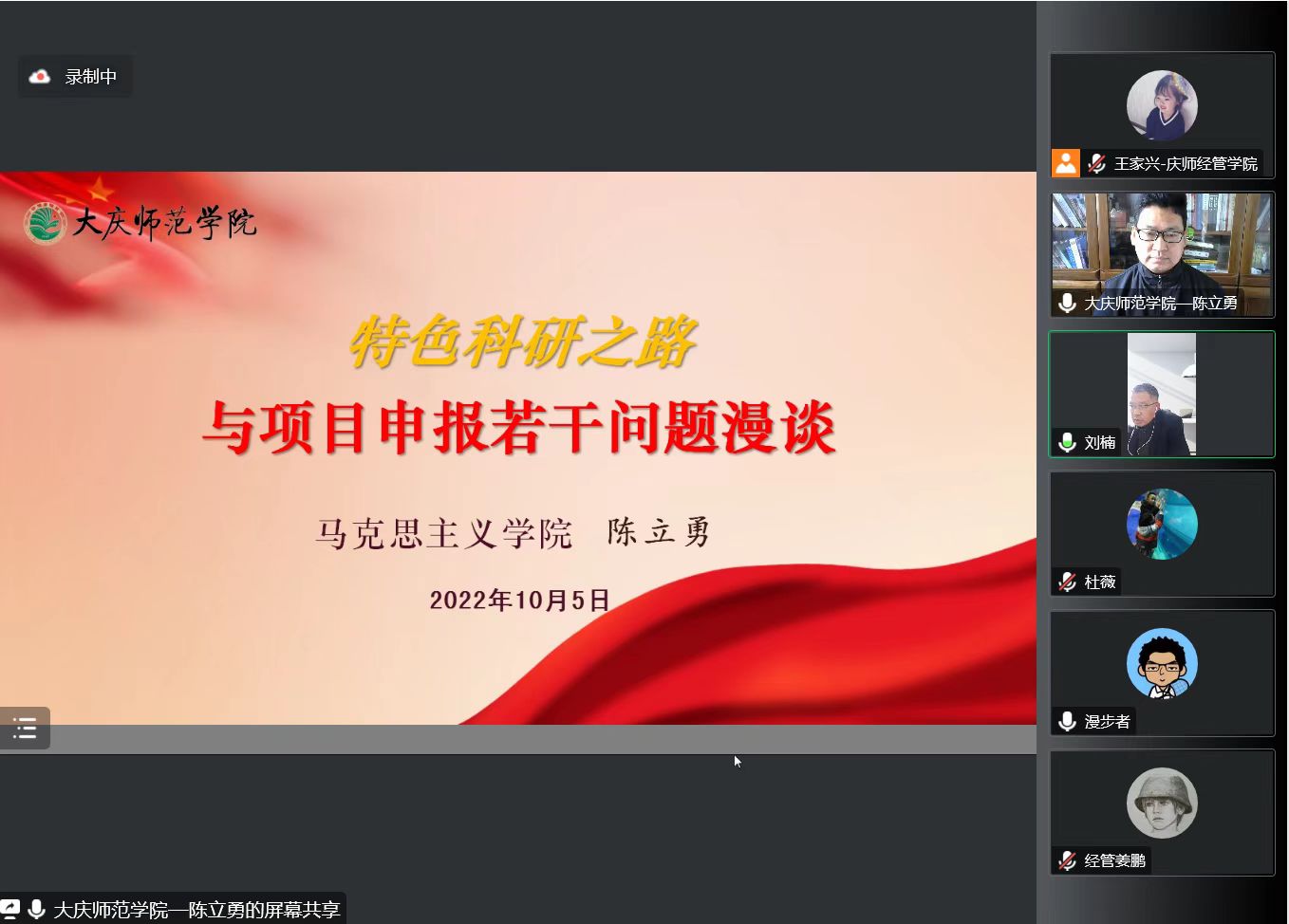 10月5日下午,黑龙江省哲学社会科学大庆精神研究基地副主任、大庆精神与龙江西部经济社会发展研究中心研究员、beat365正版唯一官网必一马克思主义学院陈立勇副教授受邀做了题为《特色科研之路与项目申报若干问题漫谈》的专题讲座。讲座采用线上腾讯会议形式,由beat365正版唯一官网必一行政负责人刘楠教授主持,部分文科学院院长、科研副院长、教师以及经管学院全体教师等100余人参会。