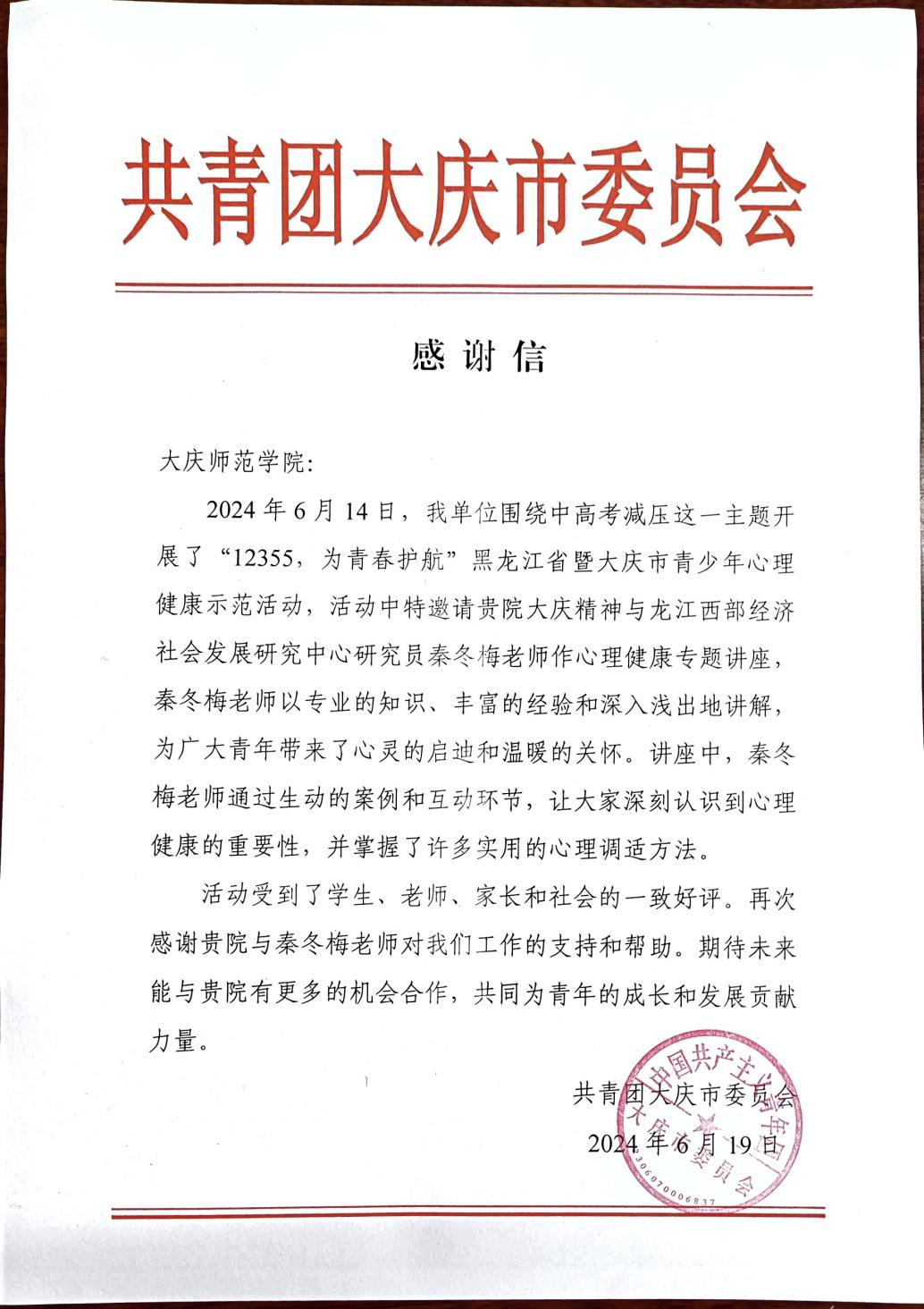 在活动结束后,我院收到了来自共青团大庆市委员会的感谢信。在感谢信中,共青团大庆市委员会对秦冬梅老师的专业知识和丰富的经验表示充分肯定,并向我院和秦冬梅老师对工作的支持和配合表示感谢。
