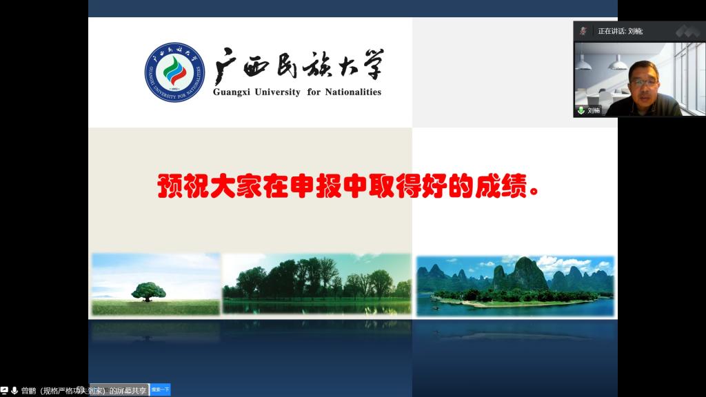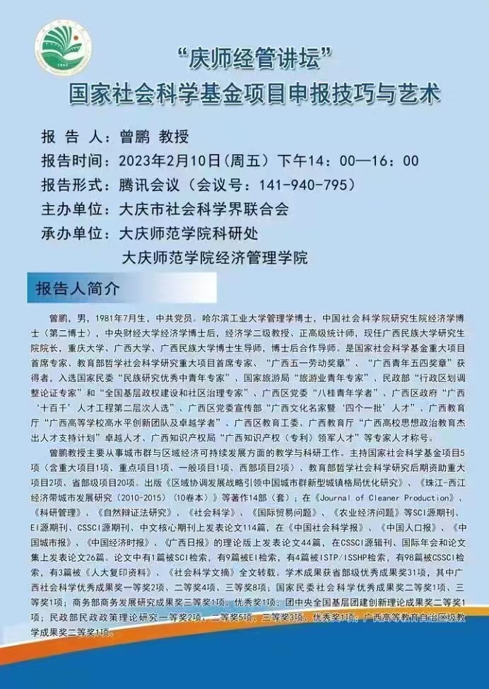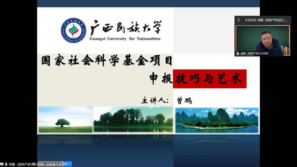 2月10日下午,广西民族大学研究生院院长,重庆大学、广西大学、广西民族大学博士生导师、博士后合作导师曾鹏教授受邀做了题为《国家社会科学基金项目申报技巧与艺术》的专题讲座。讲座采用线上腾讯会议形式,由beat365正版唯一官网必一行政负责人刘楠教授主持,科研处领导、部分文科学院院长、科研副院长、教师以及经管学院全体教师等200余人参会。