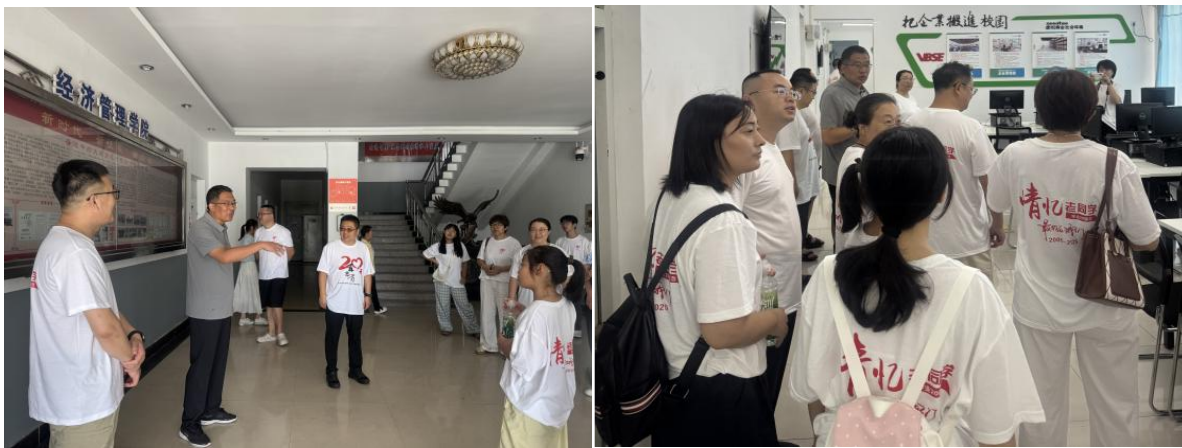 学院院长刘楠、学院办公室主任曲晔引导校友参观了经管学院教学楼。现代化的教学设施、智能化的实验室,充满人文气息的校园环境让校友们感慨万千。刘楠向校友们详细介绍了学院建院以来的跨越式发展,从学科建设的突破、师资力量的壮大,到科研成果的丰硕、校企合作的深化,每一组数据、每一张图片都凝聚着经管人的拼搏与荣耀。