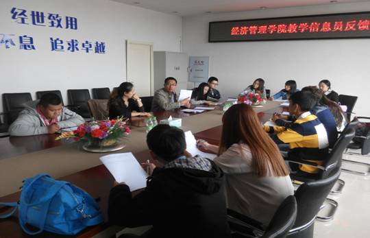 为了进一步完善教学信息反馈制度和加强对教学活动的监控与管理,使学生教学信息员更好地开展工作,经管学院于2014年9月28日中午在系楼402会议室召开了本学期我院教学信息员第一次全体会议。院长助理刘楠、院督导高磊老师、院教学秘书黄佳老师以及来自2012级,2013级及2014级共11名教学信息员参加了这次会议,刘楠副院长主持会议。