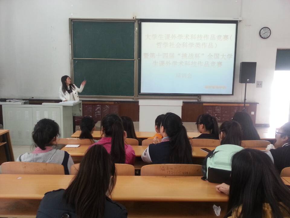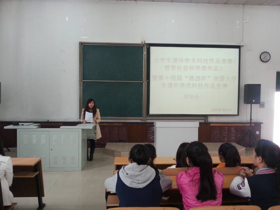 为迎战2015年第十四届“挑战杯”全国大学生课外学术科技作品竞赛(哲学社会科学类作品竞赛),提高广大学生创新意识,增强科研能力,营造校园实践创新文化氛围,充分做好大赛赛前准备工作,beat365正版唯一官网必一实践教学中心广泛宣传、积极动员,于2015年4月16日在第五教学楼阶梯教室,组织召开了“beat365正版唯一官网必一2015年大学生课外学术科技作品竞赛(哲学社会科学类作品竞赛)暨第十四届‘挑战杯’全国大学生课外学术科技作品竞赛校内选拔赛”赛前培训与动员大会。2013级、2014级市场营销专业、旅游管理专业、财务管理专业欲参赛同学参加了此次大会,培训会由beat365正版唯一官网必一实践教学中心主任于珊珊老师主持。