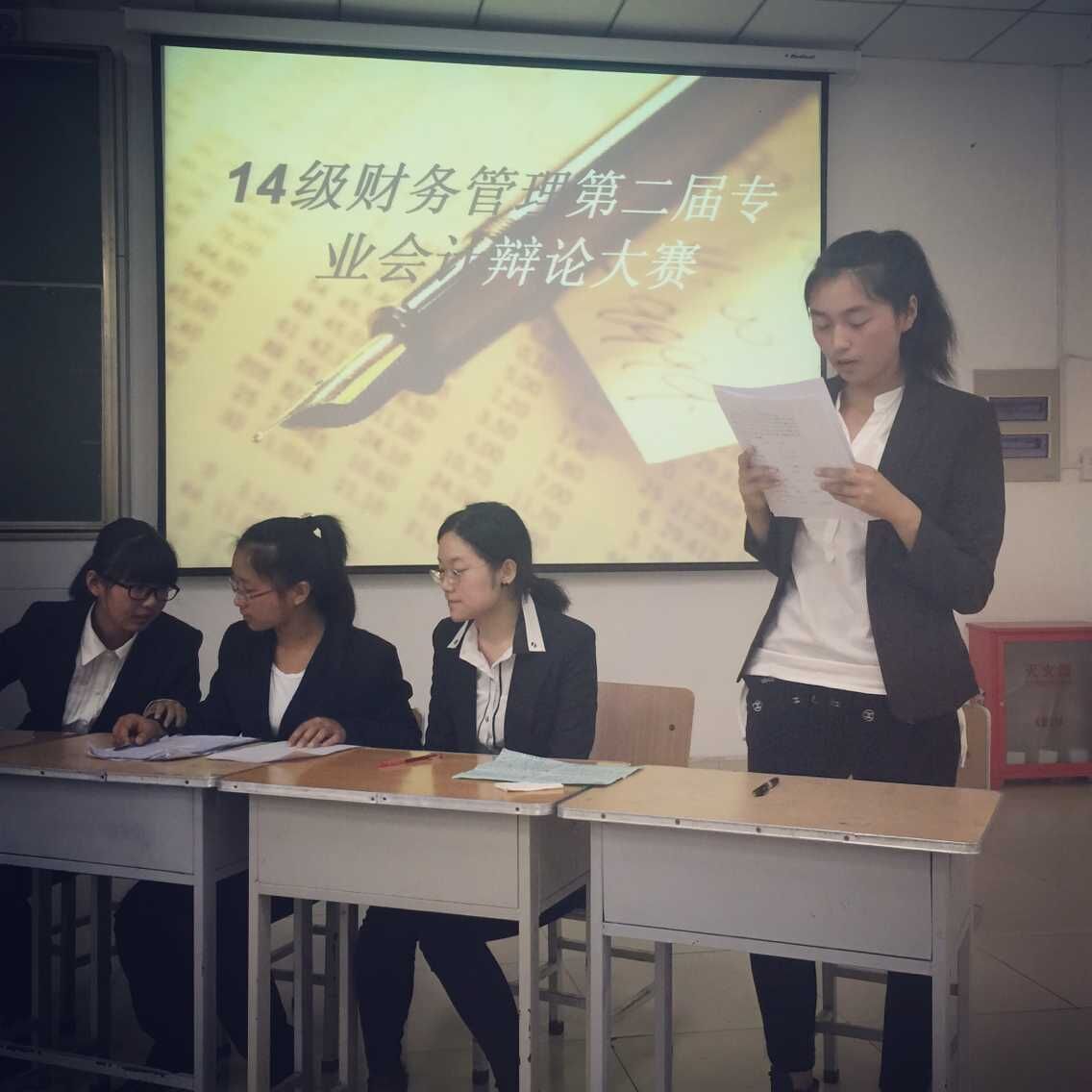 来自我校2014级财务管理学生及评委杨晓玉老师、章基学长、丁垚学姐参加了此次活动,由主持人付文宇和刘灵博主持此次辩论赛。