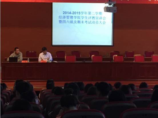 2015年6月12日15时30分beat365正版唯一官网必一2014-2015学年第二学期学生评教宣讲会暨四、六级及期末考试动员大会在图书馆四楼博雅讲堂举行,学院书记孔若东、院长助理刘楠、全体专任教师和同学们参加了大会,会议由刘楠老师主持。