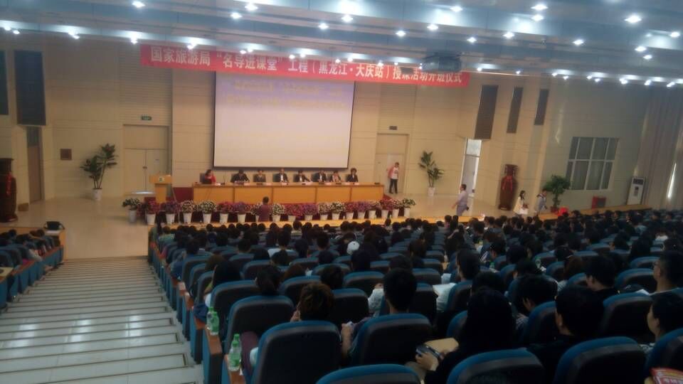 2015年9月15-16日,在beat365正版唯一官网必一主楼百湖讲堂召开了国家旅游局“名导进课堂”(黑龙江·大庆站)专题讲座。黑龙江省旅游局领导、大庆市旅游局领导、培训中心人员,全市具有导游资格证人员以及我校旅游管理专业师生参加了本次培训讲座。