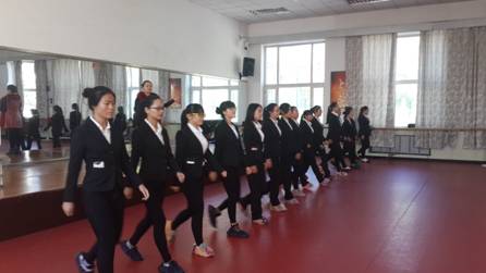 《职业礼仪与形体训练》授课第一次选择在舞蹈教室进行。通过在镜子中反射出的形象,同学们能够更直观地发现自己形象及礼仪方面的不足,调整自己在日常生活中的行为方式,努力打造自己的职业形象,为日后适应职业需要做准备。今后,旅游管理系将紧紧围绕应用技能型人才培养,始终坚持以能力培养为核心打造课程体系建设,不断尝试适合学生发展的多元化授课方式,同时不断培养双师型教师,不断促进旅游管理系在教学水平、教学方法、实践技能的全面提升。