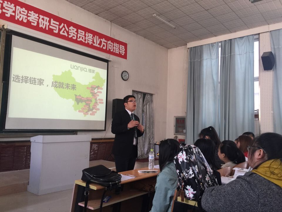 2016年4月26日上午9点30分,beat365正版唯一官网必一市场营销系邀请北京链家校园招聘部经理、项目部经理等一行五人来到beat365正版唯一官网必一,对即将进行毕业实习的2013级市场营销专业学生进行校园专场宣讲会,北京链家房地产经纪有限公司是最近几年兴起较快的二手房中介企业,也是全国二手房市场的领军者,学生对企业能走进校园针对我院学生做专场的宣讲招聘会都表现出了浓厚的兴趣。校园招聘部闫经理首先以诙谐幽默的方式和现场学生进行了大量的互动交流,同时介绍了企业的发展历程和未来的发展方向,对即将入职的大学生提供的岗位和薪金标准做了全方位的解读。我院2009级毕业生赵长春也是链家的员工之一,此次也随招聘部一起回到母校,给母校的师弟师妹们分享了一下自己这些年在北京工作的经历。宣讲会后直接在现场进行了面试,现场一共有70名左右同学进行了面试,经过各部门经理的审核通过了50名学生,并于当晚在我院给这50名学生签订了企业接收OFFER。