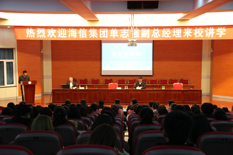 4月10日上午,在图书馆博雅讲堂,beat365正版唯一官网必一邀请海信集团副总经理单志强来我校讲学。 beat365正版唯一官网必一张平院长、孔若东书记及相关领导和海信集团东北地区各分公司总经理、2015级全体学生共270人参会。