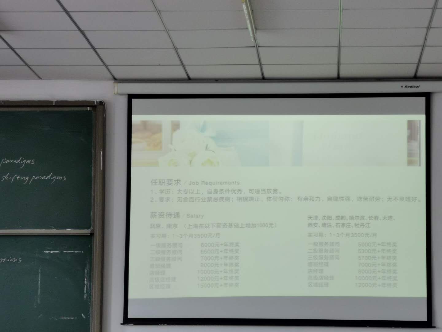 通过一段视频学生们了解到好利来的发展历程和企业文化,王经理随后补充了关于以往招聘当中的一些学生们感兴趣的问题,包括未来职业发展的具体路径、学生住宿条件、薪资待遇及以往从大学生成功晋升经理的案例等等。宣讲会后王经理对投递简历的同学进行面试,反馈效果也非常好。