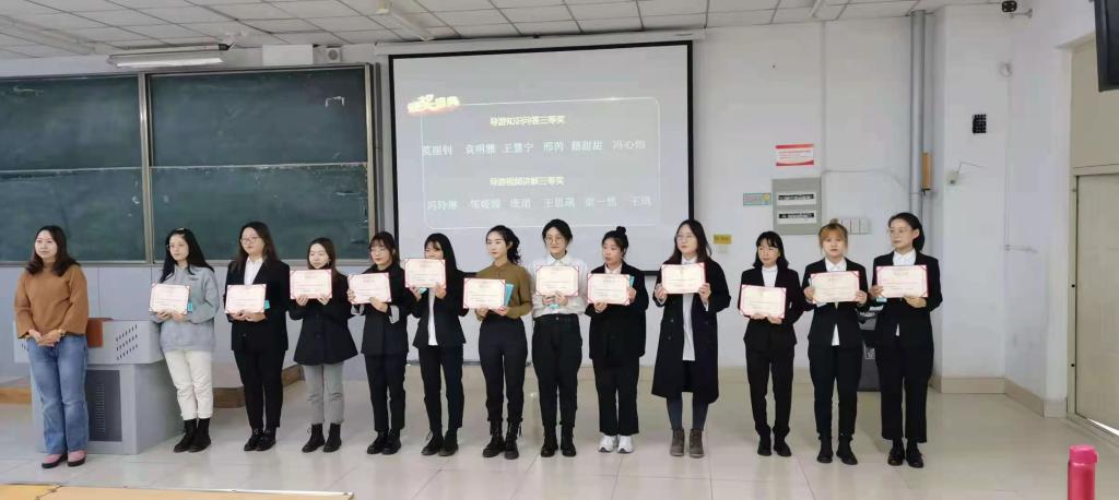 大赛共分为两个部分:一是导游视频讲解,每名学生自选景点,提交5分钟视频;一是导游知识问答,从1000道题中选择100题在学习通上进行考核。经过激烈比拼,最终决出导游视频讲解一等奖1名,二等奖3名,三等奖6名;导游知识问答一等奖1名,二等奖4名(有并列),三等奖6名。