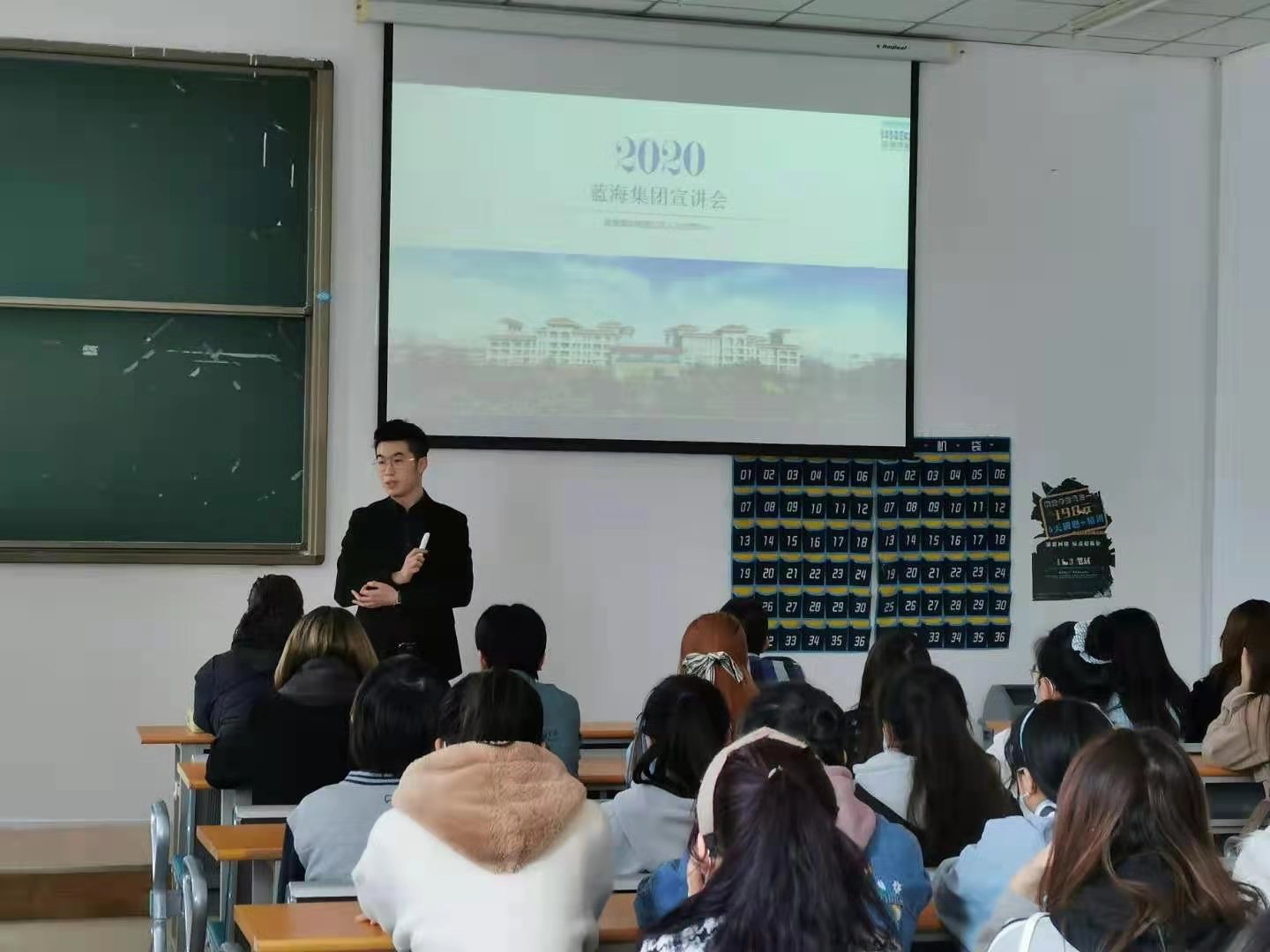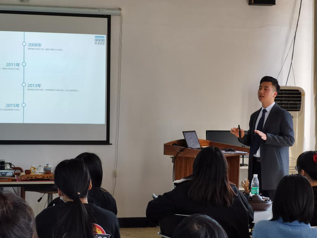 随后,在旅游管理系实训室举行了2018级旅游管理专业实习宣讲,此次宣讲由beat365正版唯一官网必一院2019届酒店管理专业优秀毕业生崔宝迪同学来主持,他详细介绍了蓝海集团发展历史并对这次实习生招聘要求进行说明,随后有意向去蓝海集团实习的同学进行了现场岗位面试。下午的议程有:在主楼115举办了面向2019级旅游管理专业学生的蓝海精英班宣讲。李淼总监详细介绍了和回顾了2018级蓝海精英班的全部过程,学生对蓝海精英班有了直观认知。随后又对本次蓝海精英班组建的要求进行了说明,学生也对感兴趣的问题进行了提问。下一步我们将着手进行蓝海精英班进行组建,班建采用学生自愿报名和企业考核形式,为2019级蓝海精英班开班做好准备。同时,蓝海集团还参与了在图书馆举办的beat365正版唯一官网必一春季校园招聘会,为我校学生就业提供了较多的较好的岗位。