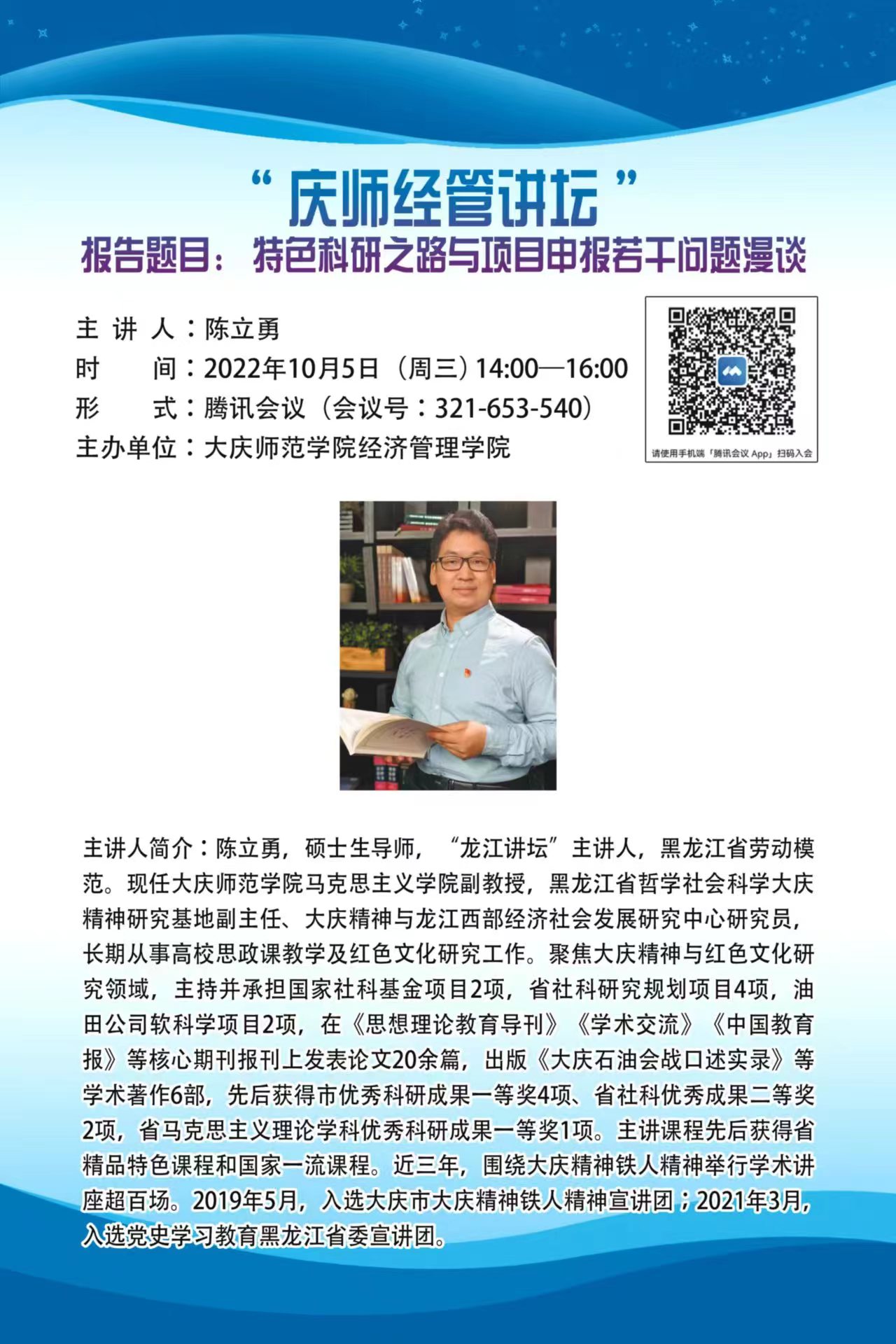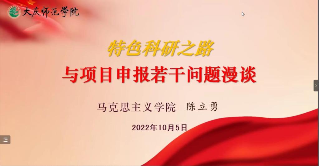 10月5日下午,黑龙江省哲学社会科学大庆精神研究基地副主任、大庆精神与龙江西部经济社会发展研究中心研究员、beat365正版唯一官网必一马克思主义学院陈立勇副教授受邀做了题为《特色科研之路与项目申报若干问题漫谈》的专题讲座。讲座采用线上腾讯会议形式,由beat365正版唯一官网必一行政负责人刘楠教授主持,部分文科学院院长、科研副院长、教师以及经管学院全体教师等100余人参会。