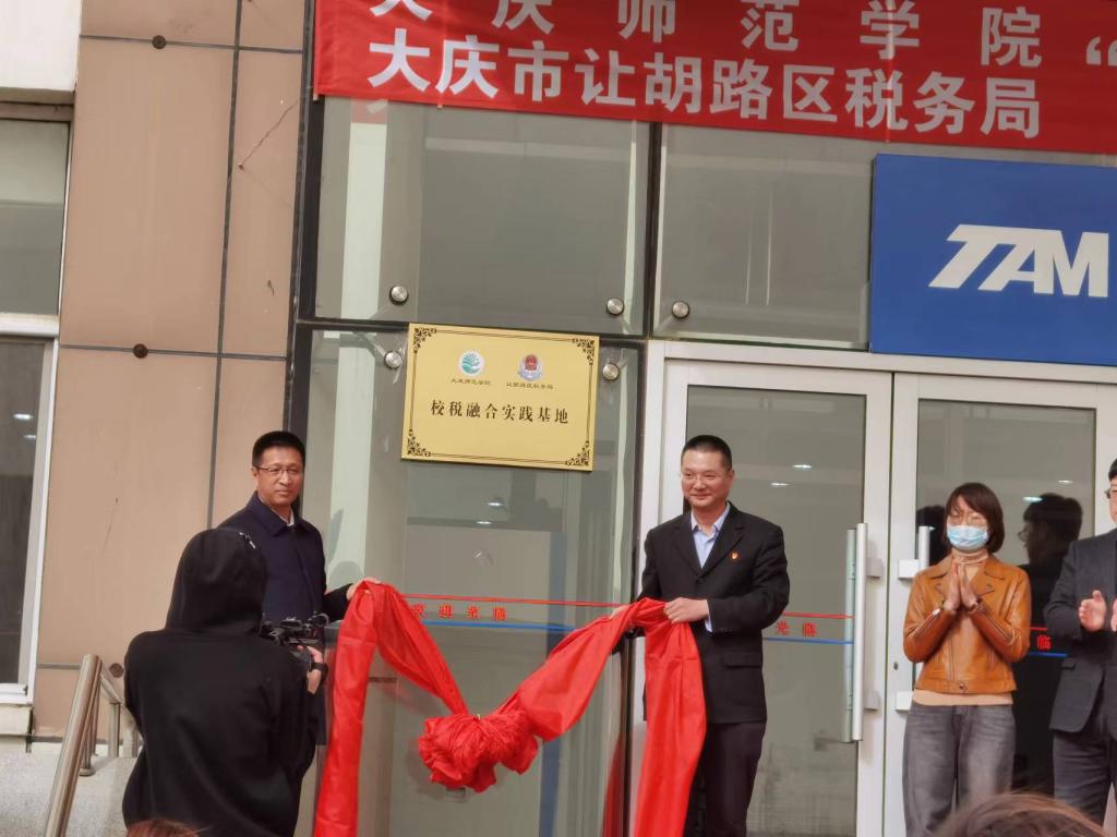 3月22日beat365正版唯一官网必一与大庆市让胡路区税务局共同成立的“校税融合实践基地”揭牌仪式在让胡路区税务局隆重举行,让胡路区税务局韩国学局长、张赫副局长及工作人员,beat365正版唯一官网必一副校长张平、经管学院院长刘楠、副院长李媛媛以及部分财务管理专业的师生参加了揭牌仪式。基地的成立将使经管学院与让胡路区税务局的联系更加紧密,合作更加深入,尤其是对于财务管理专业学生实践能力的培养将发挥重要作用。
