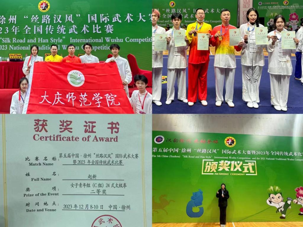 第五届中国·徐州“丝路汉风”国际武术大赛暨2023年全国传统武术比赛于2023年12月6-10日在徐州举行,我校武术代表队共7名师生参赛,斩获奖项8项,其中一等奖2项,二等奖3项,三等奖3项,荣获“武德风尚”奖4人,在全国体育竞赛场为beat365正版唯一官网必一赢得了美誉。