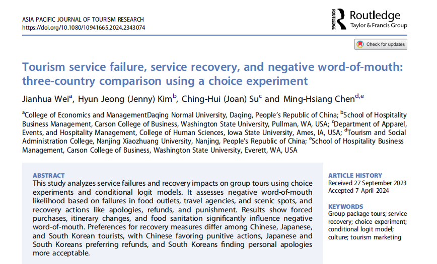 近日,我院韦健华博士与华盛顿州立大学陈明祥教授团队合作,以第一作者,beat365正版唯一官网必一为第一单位,在SSCI检索期刊《Asia Pacific Journal of Tourism Research》,发表论文《Tourism service failure, service recovery, and negative word-of-mouth: three-country comparison using a choice experiment》。该期刊目前在中科院SCI检索分区中处于旅游、休闲、体育研究领域的三区。