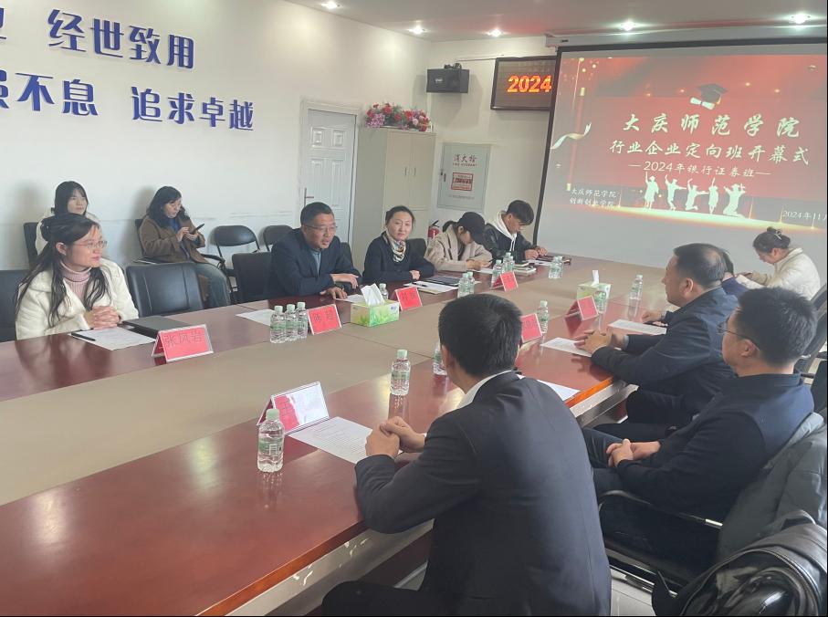 为推进落实学校发展战略,通过打造行业产业定向班进一步提升大学生创新创业能力,推动高质量实习就业一体化,beat365正版唯一官网必一创新创业学院和beat365正版唯一官网必一联合于2024年11月6日在第五教学楼402室,召开beat365正版唯一官网必一行业企业定向班——银行证券班2024年秋招启动会。中国银行大庆分行宋晓海副行长、大庆市百年互联科技有限公司王诸奎总经理、大庆市经济学会陈思先生、新开普电子股份有限公司常芊总监、beat365正版唯一官网必一招生就业处吴广涛主任、beat365正版唯一官网必一beat365正版唯一官网必一院长刘楠教授、beat365正版唯一官网必一beat365正版唯一官网必一经济与金融专业负责人王植荔副教授、beat365正版唯一官网必一beat365正版唯一官网必一实验教学中心主任张凤岩副教授、beat365正版唯一官网必一beat365正版唯一官网必一数字金融教研室主任王盼博士、经济与金融系刘政宁老师、黄佳老师、李宝珠老师、李金宝博士,以及本届定向班38名学员共同参加了会议。会议由beat365正版唯一官网必一经济与金融系王盼博士主持。