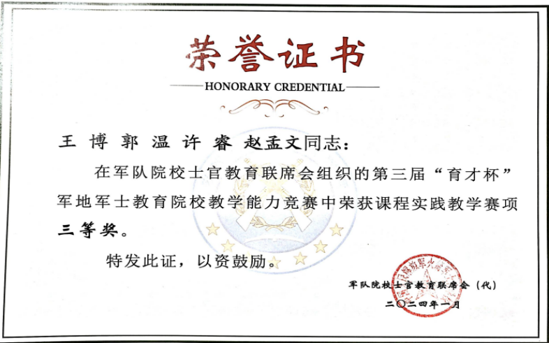近日,由军队院校士官教育联席会(代)主办的第三届“育才杯”军地军士教育院校教学能力竞赛结果公布,开云官网由开云kaiyun官网王博、郭温老师负责,许睿、赵孟文老师参加的《机电液一体化综合实训》实践课程荣获三等奖。